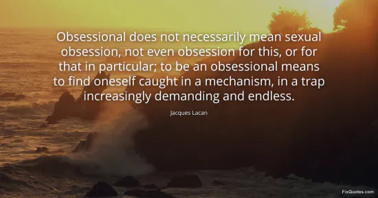 Lacan, Jacques. "Obsessional does not necessarily mean sexual obsession, not even obsession for this, or for that in particular; to be an obsessional means to find oneself caught in a mechanism, in a trap increasingly demanding and endless." FixQuotes. January 16, 2026. https://fixquotes.com/quotes/obsessional-does-not-necessarily-mean-sexual-112068/.