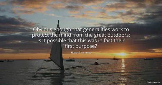 Nemerov, Howard. "Obvious enough that generalities work to protect the mind from the great outdoors; is it possible that this was in fact their first purpose?" FixQuotes. January 15, 2026. https://fixquotes.com/quotes/obvious-enough-that-generalities-work-to-protect-148560/.
