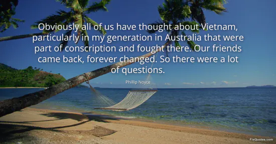 Noyce, Phillip. (2026, January 16). Obviously all of us have thought about Vietnam, particularly in my generation in Australia that were part of conscription and fought there. Our friends came back, forever changed. So there were a lot of questions. FixQuotes. https://fixquotes.com/quotes/obviously-all-of-us-have-thought-about-vietnam-115556/