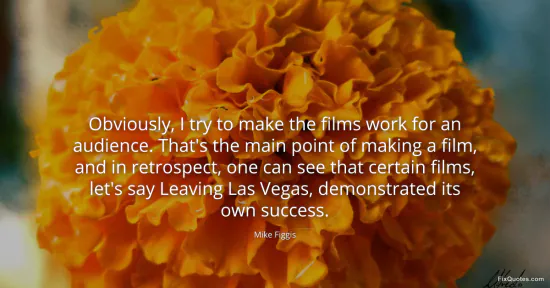 Figgis, Mike. "Obviously, I try to make the films work for an audience. That's the main point of making a film, and in retrospect, one can see that certain films, let's say Leaving Las Vegas, demonstrated its own success." FixQuotes. January 18, 2026. https://fixquotes.com/quotes/obviously-i-try-to-make-the-films-work-for-an-3580/.