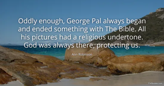 Robinson, Ann. "Oddly enough, George Pal always began and ended something with The Bible. All his pictures had a religious undertone. God was always there, protecting us." FixQuotes. January 15, 2026. https://fixquotes.com/quotes/oddly-enough-george-pal-always-began-and-ended-36148/.