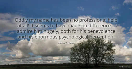 Trollope, Joanna. "Oddly my name has been no professional help at all! It seems to have made no difference. I admire him hugely, both for his benevolence and his enormous psychological perception." FixQuotes. January 16, 2026. https://fixquotes.com/quotes/oddly-my-name-has-been-no-professional-help-at-91752/.