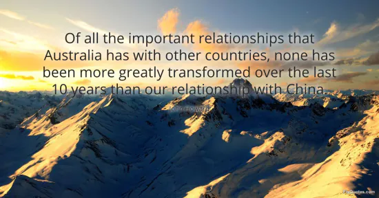 "Of all the important relationships that Australia has with other countries, none has been more greatly transformed over the last 10 years than our relationship with China." FixQuotes, 16 Jan. 2026, https://fixquotes.com/quotes/of-all-the-important-relationships-that-australia-125166/. Accessed 12 Feb. 2026.