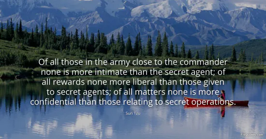 "Of all those in the army close to the commander none is more intimate than the secret agent; of all rewards none more liberal than those given to secret agents; of all matters none is more confidential than those relating to secret operations." FixQuotes, 17 Jan. 2026, https://fixquotes.com/quotes/of-all-those-in-the-army-close-to-the-commander-28436/. Accessed 12 Feb. 2026.