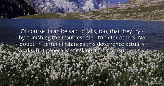 Deming, Barbara. (2026, January 15). Of course it can be said of jails, too, that they try - by punishing the troublesome - to deter others. No doubt, in certain instances this deterrence actually works. But generally speaking it fails conspicuously. FixQuotes. https://fixquotes.com/quotes/of-course-it-can-be-said-of-jails-too-that-they-138529/