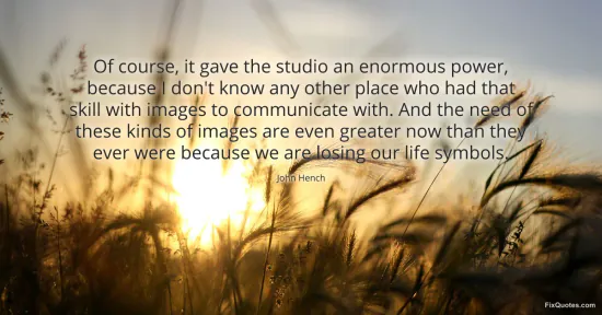 Hench, John. (2026, January 17). Of course, it gave the studio an enormous power, because I don't know any other place who had that skill with images to communicate with. And the need of these kinds of images are even greater now than they ever were because we are losing our life symbols. FixQuotes. https://fixquotes.com/quotes/of-course-it-gave-the-studio-an-enormous-power-80324/