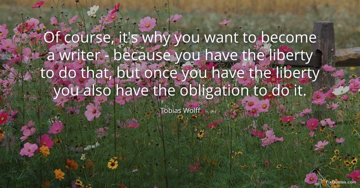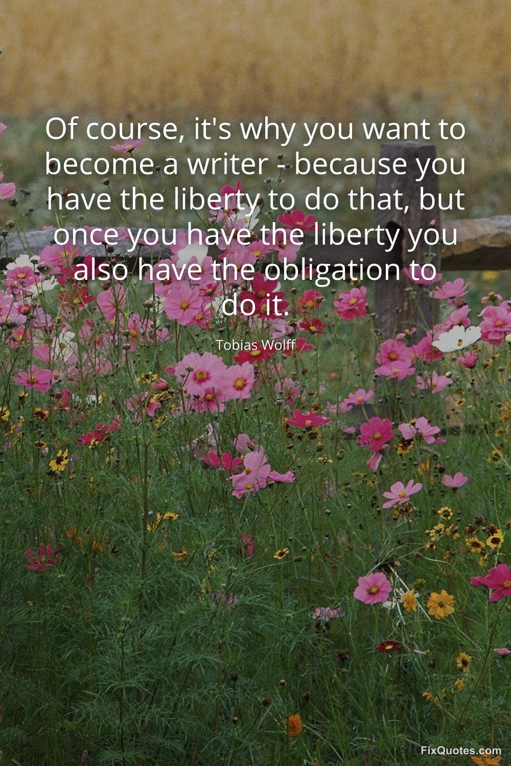 Wolff, Tobias. (2026, February 17). Of course, it's why you want to become a writer - because you have the liberty to do that, but once you have the liberty you also have the obligation to do it. FixQuotes. https://fixquotes.com/quotes/of-course-its-why-you-want-to-become-a-writer-105428/