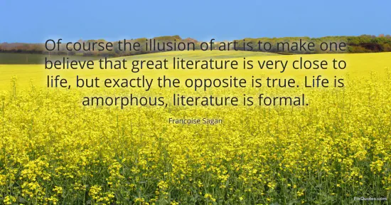 Sagan, Francoise. (2026, January 18). Of course the illusion of art is to make one believe that great literature is very close to life, but exactly the opposite is true. Life is amorphous, literature is formal. FixQuotes. https://fixquotes.com/quotes/of-course-the-illusion-of-art-is-to-make-one-14480/