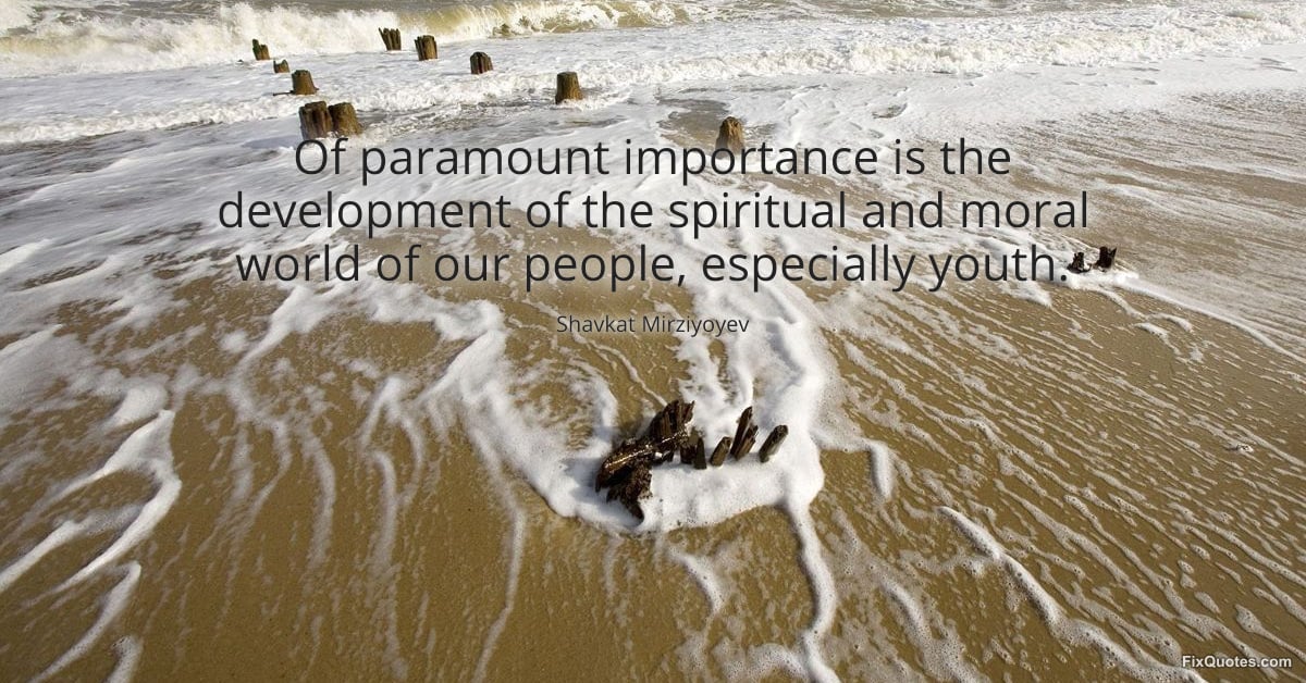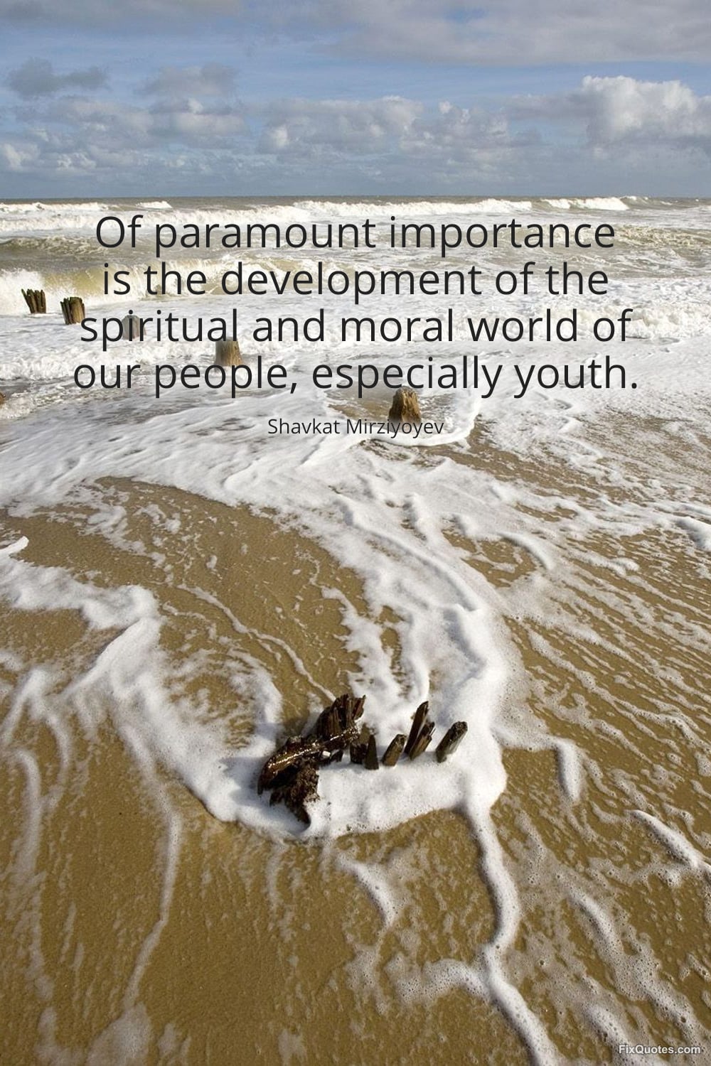 Mirziyoyev, Shavkat. (2026, March 7). Of paramount importance is the development of the spiritual and moral world of our people, especially youth. FixQuotes. https://fixquotes.com/quotes/of-paramount-importance-is-the-development-of-the-185726/