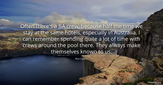 Phil Collins is describing celebrity as a kind of accidental layover culture: less red carpet, more poolside routines, where the same itineraries keep producing the same micro-communities. The “BA crew” detail is doing a lot of work. It’s banal on purpose, a concrete shorthand for how fame actually travels: packaged through airlines, hotels, and repeatable logistics. Australia isn’t framed as exotic; it’s framed as familiar, almost suburban in its sameness, because touring turns the world into a chain of interchangeable service corridors.