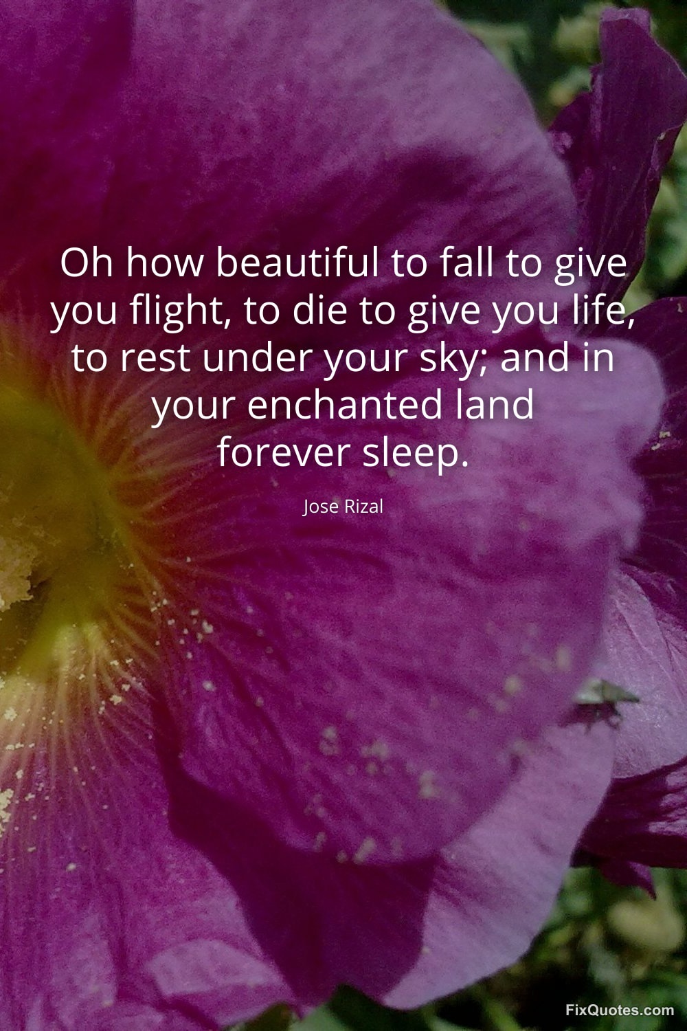 Rizal, Jose. "Oh how beautiful to fall to give you flight, to die to give you life, to rest under your sky; and in your enchanted land forever sleep." FixQuotes. February 10, 2026. https://fixquotes.com/quotes/oh-how-beautiful-to-fall-to-give-you-flight-to-185074/.