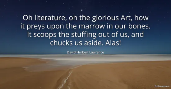 Lawrence, David Herbert. "Oh literature, oh the glorious Art, how it preys upon the marrow in our bones. It scoops the stuffing out of us, and chucks us aside. Alas!" FixQuotes. January 16, 2026. https://fixquotes.com/quotes/oh-literature-oh-the-glorious-art-how-it-preys-137429/.
