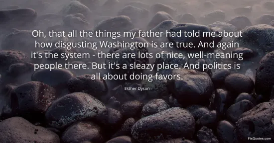 Dyson, Esther. "Oh, that all the things my father had told me about how disgusting Washington is are true. And again it's the system - there are lots of nice, well-meaning people there. But it's a sleazy place. And politics is all about doing favors." FixQuotes. January 17, 2026. https://fixquotes.com/quotes/oh-that-all-the-things-my-father-had-told-me-59956/.