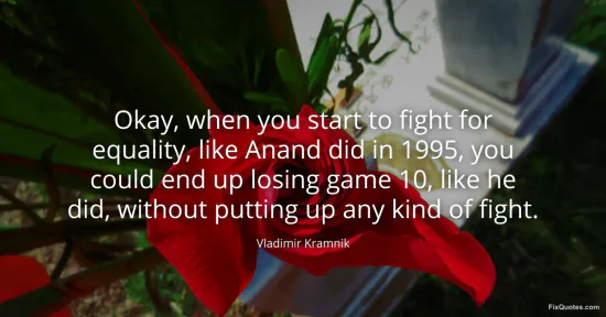 Kramnik, Vladimir. "Okay, when you start to fight for equality, like Anand did in 1995, you could end up losing game 10, like he did, without putting up any kind of fight." FixQuotes. January 15, 2026. https://fixquotes.com/quotes/okay-when-you-start-to-fight-for-equality-like-154272/.