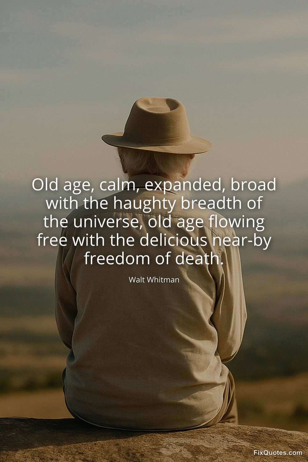 Whitman, Walt. (2026, January 15). Old age, calm, expanded, broad with the haughty breadth of the universe, old age flowing free with the delicious near-by freedom of death. FixQuotes. https://fixquotes.com/quotes/old-age-calm-expanded-broad-with-the-haughty-53242/