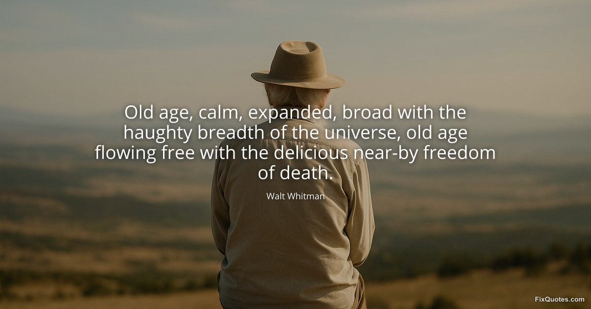 "Old age, calm, expanded, broad with the haughty breadth of the universe, old age flowing free with the delicious near-by freedom of death." FixQuotes, 15 Jan. 2026, https://fixquotes.com/quotes/old-age-calm-expanded-broad-with-the-haughty-53242/. Accessed 12 Feb. 2026.
