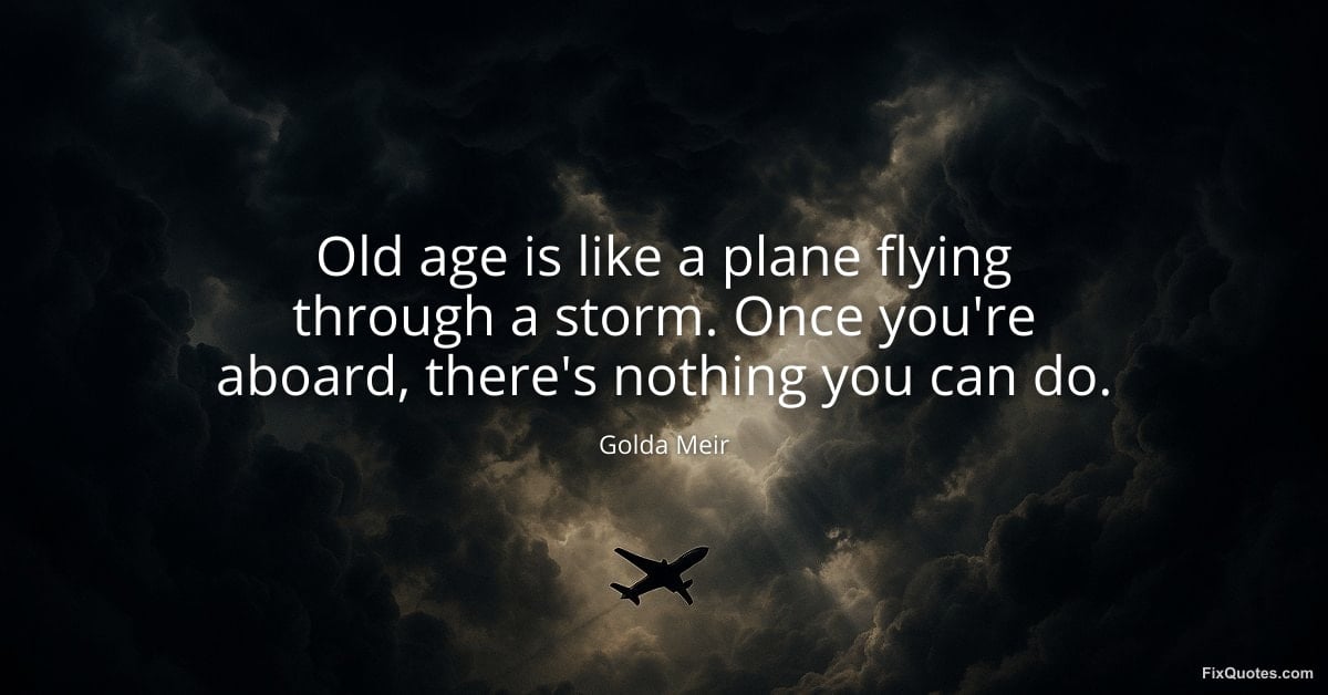 Meir, Golda. "Old age is like a plane flying through a storm. Once you're aboard, there's nothing you can do." FixQuotes. January 11, 2026. https://fixquotes.com/quotes/old-age-is-like-a-plane-flying-through-a-storm-127111/.