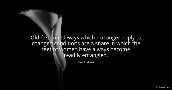 Addams, Jane. (2026, January 15). Old-fashioned ways which no longer apply to changed conditions are a snare in which the feet of women have always become readily entangled. FixQuotes. https://fixquotes.com/quotes/old-fashioned-ways-which-no-longer-apply-to-162139/