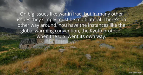 Blix, Hans. "On big issues like war in Iraq, but in many other issues they simply must be multilateral. There's no other way around. You have the instances like the global warming convention, the Kyoto protocol, when the U.S. went its own way." FixQuotes. January 15, 2026. https://fixquotes.com/quotes/on-big-issues-like-war-in-iraq-but-in-many-other-71493/.