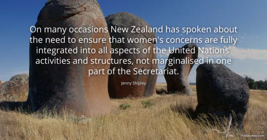 Shipley, Jenny. (2026, January 15). On many occasions New Zealand has spoken about the need to ensure that women's concerns are fully integrated into all aspects of the United Nations' activities and structures, not marginalised in one part of the Secretariat. FixQuotes. https://fixquotes.com/quotes/on-many-occasions-new-zealand-has-spoken-about-160423/