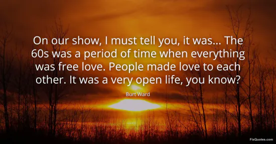 Ward, Burt. "On our show, I must tell you, it was... The 60s was a period of time when everything was free love. People made love to each other. It was a very open life, you know?" FixQuotes. February 19, 2026. https://fixquotes.com/quotes/on-our-show-i-must-tell-you-it-was-the-60s-was-a-47200/.