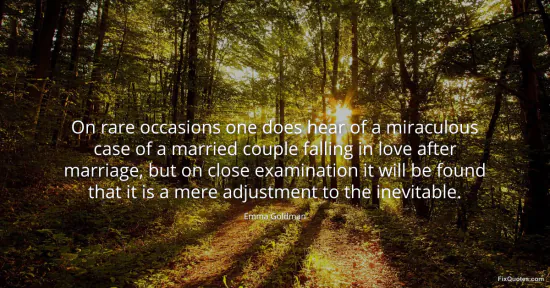 Goldman, Emma. "On rare occasions one does hear of a miraculous case of a married couple falling in love after marriage, but on close examination it will be found that it is a mere adjustment to the inevitable." FixQuotes. January 17, 2026. https://fixquotes.com/quotes/on-rare-occasions-one-does-hear-of-a-miraculous-58278/.