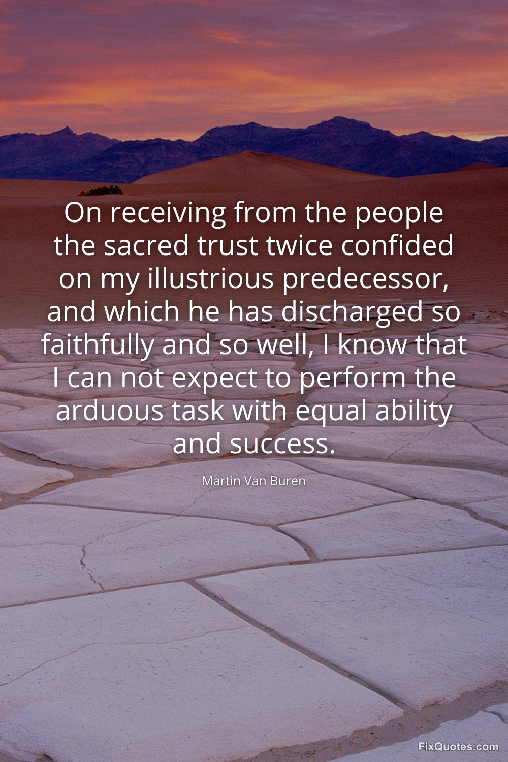 Buren, Martin Van. (2026, January 16). On receiving from the people the sacred trust twice confided on my illustrious predecessor, and which he has discharged so faithfully and so well, I know that I can not expect to perform the arduous task with equal ability and success. FixQuotes. https://fixquotes.com/quotes/on-receiving-from-the-people-the-sacred-trust-120163/