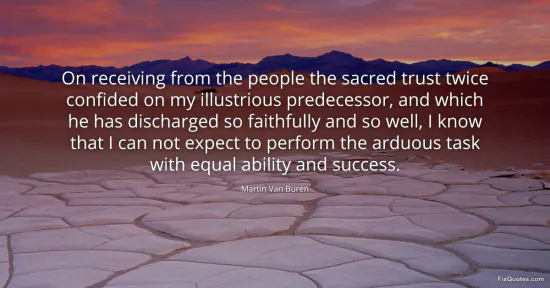 Buren, Martin Van. "On receiving from the people the sacred trust twice confided on my illustrious predecessor, and which he has discharged so faithfully and so well, I know that I can not expect to perform the arduous task with equal ability and success." FixQuotes. January 16, 2026. https://fixquotes.com/quotes/on-receiving-from-the-people-the-sacred-trust-120163/.