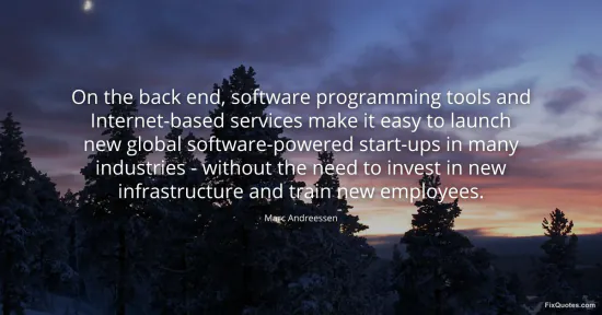 Andreessen’s sentence is venture capital as prophecy: a calm description of tooling that smuggles in a worldview about power, labor, and what counts as “real” economic activity. The surface claim is practical - cloud services, open-source stacks, and web distribution let a small team ship globally. The subtext is the real pitch: software is no longer just an industry, it’s a lever that can be pulled anywhere to rearrange incumbents. When he says “without the need to invest in new infrastructure,” he’s not only celebrating efficiency; he’s reframing infrastructure as someone else’s problem. The heavy lifting has been abstracted into platforms, APIs, and outsourced capacity that startups rent by the minute.