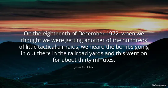 Stockdale, James. (2026, January 16). On the eighteenth of December 1972, when we thought we were getting another of the hundreds of little tactical air raids, we heard the bombs going in out there in the railroad yards and this went on for about thirty minutes. FixQuotes. https://fixquotes.com/quotes/on-the-eighteenth-of-december-1972-when-we-106472/