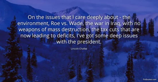 Chafee, Lincoln. (2026, January 15). On the issues that I care deeply about - the environment, Roe vs. Wade, the war in Iraq, with no weapons of mass destruction, the tax cuts that are now leading to deficits, I've got some deep issues with the president. FixQuotes. https://fixquotes.com/quotes/on-the-issues-that-i-care-deeply-about-the-147493/