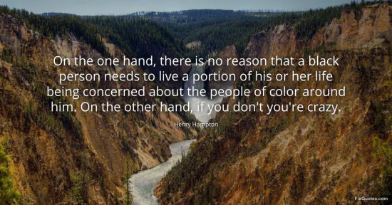 Hampton, Henry. "On the one hand, there is no reason that a black person needs to live a portion of his or her life being concerned about the people of color around him. On the other hand, if you don't you're crazy." FixQuotes. January 15, 2026. https://fixquotes.com/quotes/on-the-one-hand-there-is-no-reason-that-a-black-146205/.