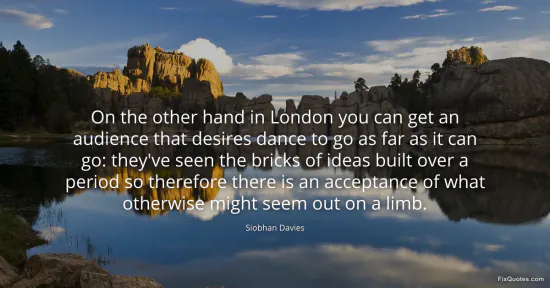 Davies, Siobhan. (2026, January 17). On the other hand in London you can get an audience that desires dance to go as far as it can go: they've seen the bricks of ideas built over a period so therefore there is an acceptance of what otherwise might seem out on a limb. FixQuotes. https://fixquotes.com/quotes/on-the-other-hand-in-london-you-can-get-an-81816/