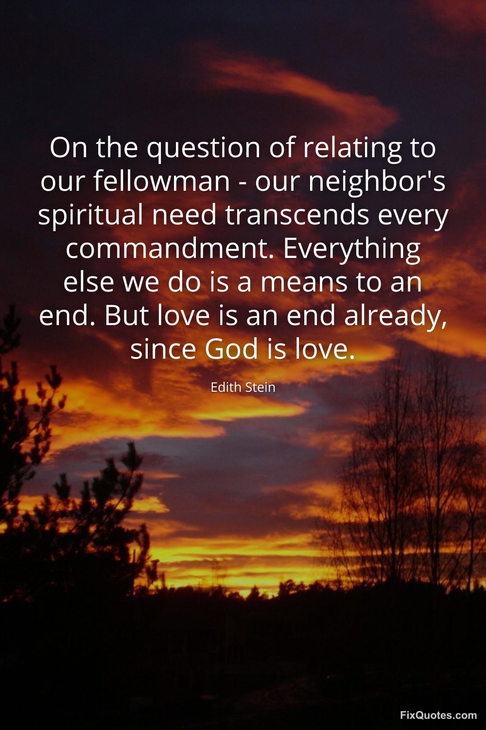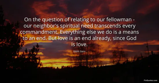 Stein, Edith. (2026, January 18). On the question of relating to our fellowman - our neighbor's spiritual need transcends every commandment. Everything else we do is a means to an end. But love is an end already, since God is love. FixQuotes. https://fixquotes.com/quotes/on-the-question-of-relating-to-our-fellowman-6679/