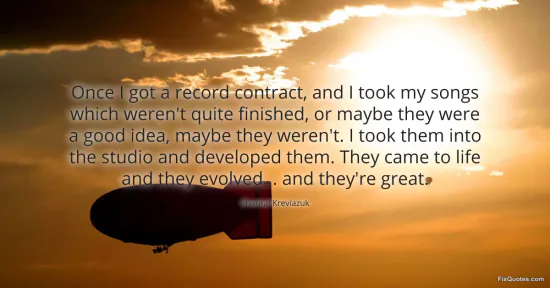 Kreviazuk, Chantal. (2026, January 17). Once I got a record contract, and I took my songs which weren't quite finished, or maybe they were a good idea, maybe they weren't. I took them into the studio and developed them. They came to life and they evolved... and they're great. FixQuotes. https://fixquotes.com/quotes/once-i-got-a-record-contract-and-i-took-my-songs-41156/