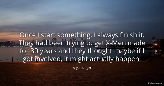 Singer, Bryan. (2026, January 16). Once I start something, I always finish it. They had been trying to get X-Men made for 30 years and they thought maybe if I got involved, it might actually happen. FixQuotes. https://fixquotes.com/quotes/once-i-start-something-i-always-finish-it-they-128412/