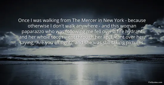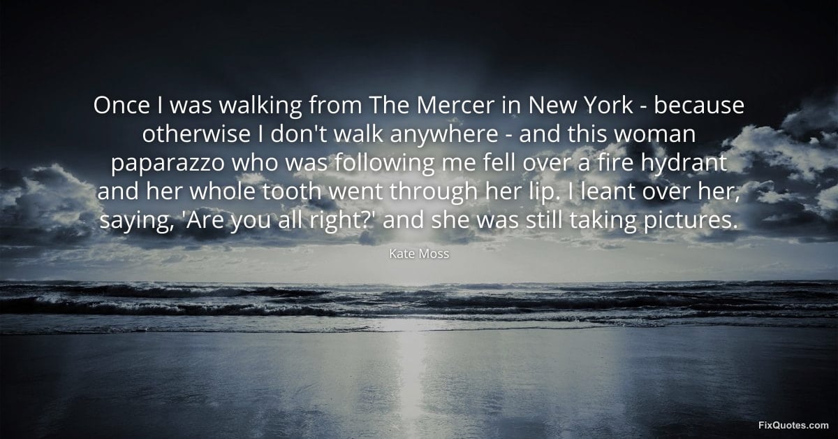 Moss, Kate. (2026, January 15). Once I was walking from The Mercer in New York - because otherwise I don't walk anywhere - and this woman paparazzo who was following me fell over a fire hydrant and her whole tooth went through her lip. I leant over her, saying, 'Are you all right?' and she was still taking pictures. FixQuotes. https://fixquotes.com/quotes/once-i-was-walking-from-the-mercer-in-new-york-78788/