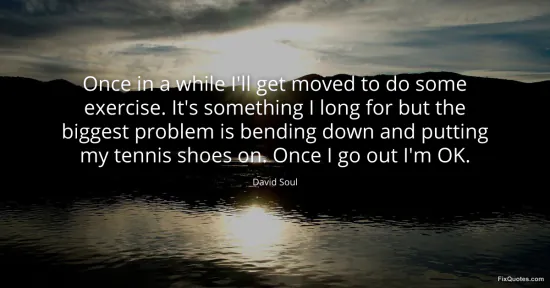 Soul, David. "Once in a while I'll get moved to do some exercise. It's something I long for but the biggest problem is bending down and putting my tennis shoes on. Once I go out I'm OK." FixQuotes. January 17, 2026. https://fixquotes.com/quotes/once-in-a-while-ill-get-moved-to-do-some-exercise-58471/.