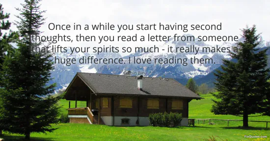 "Once in a while you start having second thoughts, then you read a letter from someone that lifts your spirits so much - it really makes a huge difference. I love reading them." FixQuotes, 16 Jan. 2026, https://fixquotes.com/quotes/once-in-a-while-you-start-having-second-thoughts-99557/. Accessed 12 Feb. 2026.