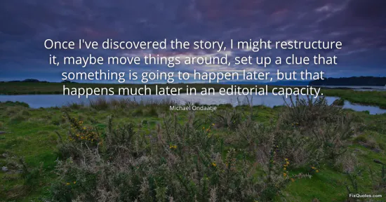 Ondaatje, Michael. "Once I've discovered the story, I might restructure it, maybe move things around, set up a clue that something is going to happen later, but that happens much later in an editorial capacity." FixQuotes. January 16, 2026. https://fixquotes.com/quotes/once-ive-discovered-the-story-i-might-restructure-93853/.