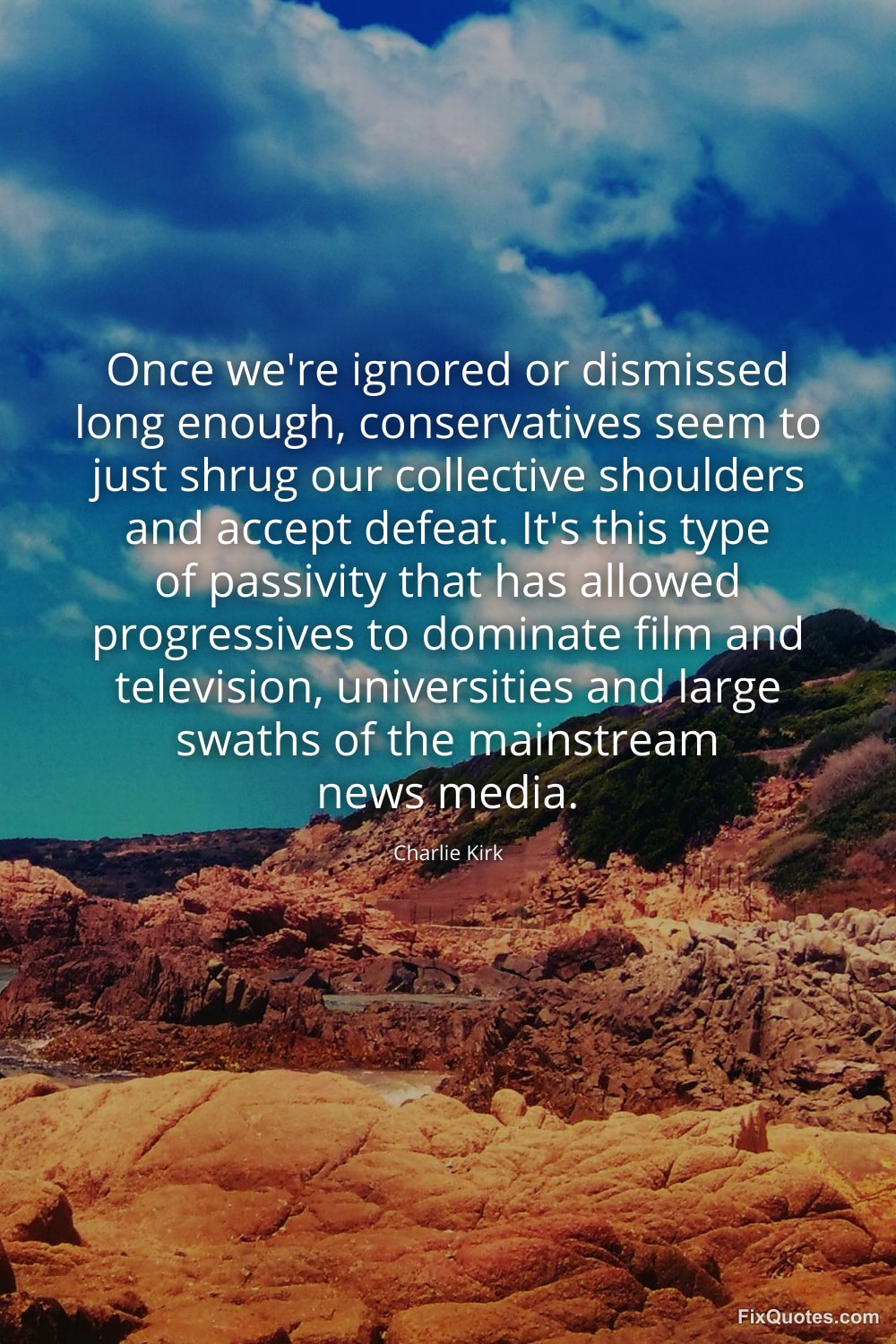 Kirk, Charlie. "Once we're ignored or dismissed long enough, conservatives seem to just shrug our collective shoulders and accept defeat. It's this type of passivity that has allowed progressives to dominate film and television, universities and large swaths of the mainstream news media." FixQuotes. January 14, 2026. https://fixquotes.com/quotes/once-were-ignored-or-dismissed-long-enough-173243/.