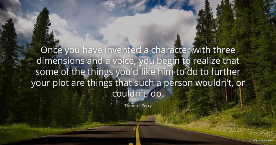 Perry, Thomas. (2026, January 16). Once you have invented a character with three dimensions and a voice, you begin to realize that some of the things you'd like him to do to further your plot are things that such a person wouldn't, or couldn't, do. FixQuotes. https://fixquotes.com/quotes/once-you-have-invented-a-character-with-three-92231/