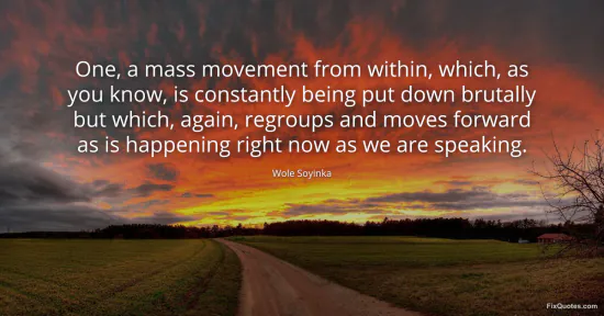 Soyinka, Wole. (2026, January 15). One, a mass movement from within, which, as you know, is constantly being put down brutally but which, again, regroups and moves forward as is happening right now as we are speaking. FixQuotes. https://fixquotes.com/quotes/one-a-mass-movement-from-within-which-as-you-know-168738/