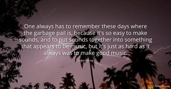 Moog, Robert. "One always has to remember these days where the garbage pail is, because it's so easy to make sounds, and to put sounds together into something that appears to be music, but it's just as hard as it always was to make good music." FixQuotes. January 15, 2026. https://fixquotes.com/quotes/one-always-has-to-remember-these-days-where-the-91870/.