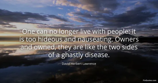 Lawrence, David Herbert. (2026, January 17). One can no longer live with people: it is too hideous and nauseating. Owners and owned, they are like the two sides of a ghastly disease. FixQuotes. https://fixquotes.com/quotes/one-can-no-longer-live-with-people-it-is-too-33566/