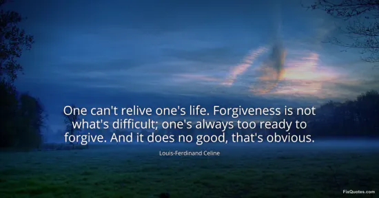 Celine, Louis-Ferdinand. (2026, January 18). One can't relive one's life. Forgiveness is not what's difficult; one's always too ready to forgive. And it does no good, that's obvious. FixQuotes. https://fixquotes.com/quotes/one-cant-relive-ones-life-forgiveness-is-not-21260/