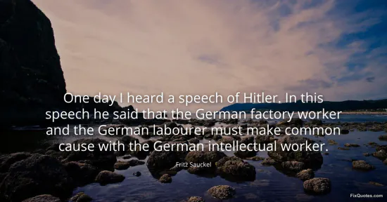 "One day I heard a speech of Hitler. In this speech he said that the German factory worker and the German labourer must make common cause with the German intellectual worker." FixQuotes, 15 Jan. 2026, https://fixquotes.com/quotes/one-day-i-heard-a-speech-of-hitler-in-this-speech-144946/. Accessed 12 Feb. 2026.