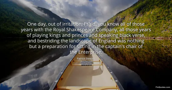 "One day, out of irritation, I said, you know all of those years with the Royal Shakespeare Company, all those years of playing kings and princes and speaking black verse, and bestriding the landscape of England was nothing but a preparation for sitting in the captain's chair of the Enterprise." FixQuotes, 16 Jan. 2026, https://fixquotes.com/quotes/one-day-out-of-irritation-i-said-you-know-all-of-82752/. Accessed 12 Feb. 2026.