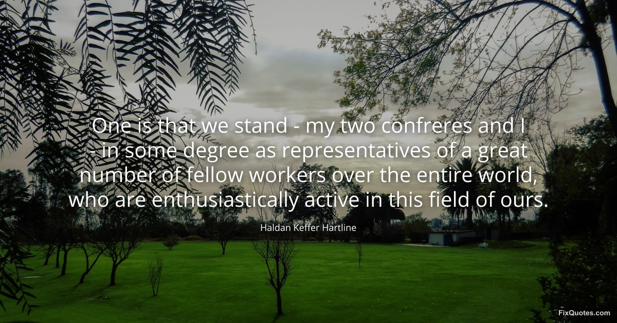 Hartline, Haldan Keffer. (2026, January 16). One is that we stand - my two confreres and I - in some degree as representatives of a great number of fellow workers over the entire world, who are enthusiastically active in this field of ours. FixQuotes. https://fixquotes.com/quotes/one-is-that-we-stand-my-two-confreres-and-i-115139/