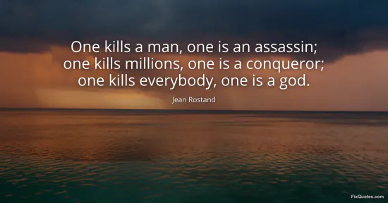 Rostand, Jean. "One kills a man, one is an assassin; one kills millions, one is a conqueror; one kills everybody, one is a god." FixQuotes. January 18, 2026. https://fixquotes.com/quotes/one-kills-a-man-one-is-an-assassin-one-kills-11592/.